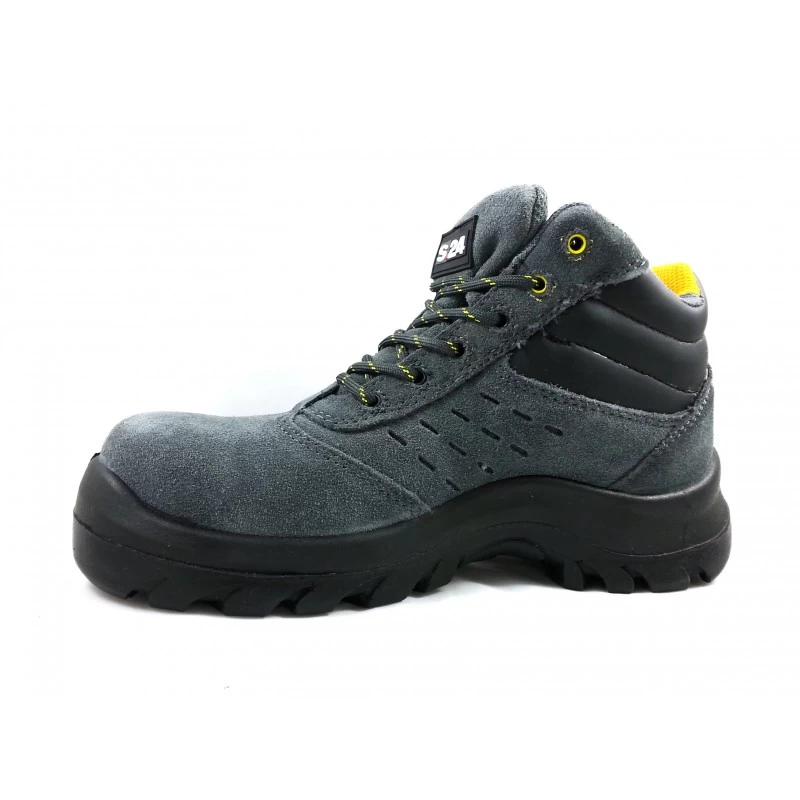 La chaussure de sécurité mixte homme femme Copa haute est aux normes EN ISO 20345 S1P SRA Tige cuir croute de velours perforé gris Doublure Textile Embout de sécurité composite STC Semelle anti-perforation composite SMS+ Semelle extérieure polyuréthane Semelle intérieure SENSATION Semelle intermédiaire polyuréthane Coloris : Gris Pointure mixte du 36 au 48 (Poids : 578g pour un pied en 42) Chaussure de sécurité S24 homme montant 5702 Copa S1P